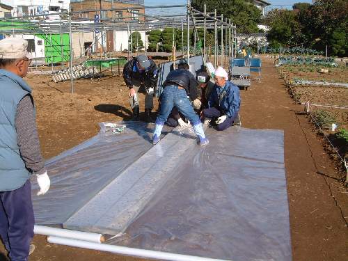 底に敷くビニールシートをまずは整えて・・・。2つのシートの合わせ目にテープを張りましょう。