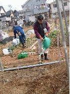 | お水運びも大変だぁ―03/04/23  説明: 共同区画の小松菜に、洗い場のそばにある風呂おけから、雨水を運んでいます。これが結構大変なのよねぇ。