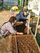| 《4.今日のAGP》 : 正面花壇にチューリップとパンジー植えました | | 投稿者 primu_la 投稿日時 2004-11-17 21:54:27 (1101 ヒット) | 園芸部と技術部で、正面花壇にチューリップの球根やパンジーの苗などを植えました。 パンジーはポットから取り出し、正面入り口の花壇に黄色と青色の2色を植えました。きれいに並べるのが結構難しくて、Hさんは「途中でわけわかんなくなっちゃった」とヘルプを要請。苗の間隔をみながら、植え替えをしました。 チューリップは、球根の穴あけ棒で、すいすい順調に球根を植えました。今春と違って、チューリップが目立つレイアウトなので、来春花が咲くのがとっても楽しみです。 手前には葉っぱが伸びているムスカリを植えて、ひとまずメイン花壇は終了です。 「このサルビア、ポプリに使いたいわぁ〜」とIさん。赤色がちゃんと残るので、ポプリにするときれいだというので、ざるを持ってきて花びら摘みとなりました。サルビアもまだまだ綺麗に咲きそうですが、土作りをするために、花摘み後撤去され、今日の作業はを終えました。園芸部と技術部の皆さん、本当にお疲れ様でした。