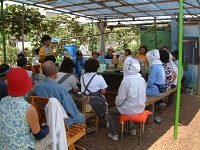 | 《4.今日のAGP》 : 8月全体会の報告 | | 投稿者 primu_la 投稿日時 2004-8-1 17:04:49 (1118 ヒット) | 8月1日(日)午前11時から8月全体会を行いました。暑い中約40名のエコボランティアが参加。 Mさんの司会で、各部から連絡事項や活動の報告を行い、熱中症対策もかねて、冷たいお茶を飲みながらの楽しい全体会となりました。7月はパーマカルチャー・ジャパンの視察や北千住駅前の大型ビジョン放映によるジャガイモ堀りの撮影、NHK「難問解決!ご近所の底力」のエコプチでの撮影やスタジオ収録など普段の活動を紹介するいい機会に恵まれました。
