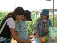 | 《4.今日のAGP》 : 夏休みの宿題 | | 投稿者 river-rat 投稿日時 2004-8-27 17:38:05 (1101 ヒット) | 8月27日、Mくんがお母さんと夏休みの宿題をしにやってきました。 先日放送された、NHK『難問解決!ご近所の底力』の放送を見てこの場所を知ったそうです。 宿題のテーマは「夏の野菜と果物を調べる」でした。果物はそれほどありませんが、エコ農園の夏野菜を探しながら散策。 「今年は暑かったから、キュウリやトマトは出来がよくなかったけれど、ナスやニガウリは豊作だったのよ。野菜の収穫は天候にとても左右されるんです」 と解説するIさん。実は野菜嫌いのMくん。今回の宿題をきっかけに、野菜好きになってくれるといいですね。また遊びに来てください。