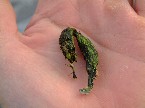 ヒヨドリに食べ尽くされ、葉脈だけになった無残な小松菜の上には、写真のような緑の物体が残されていました。これはナチュラリストの間では「フィールドサイン」と呼ばれ、生物が残した痕跡を指します。私たちは糞と呼んでいますが。それにしても見事なくらい緑ですね。