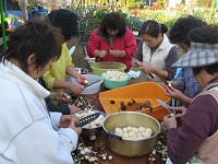 収穫後のイモ煮会の下準備として、里芋と大根などの皮むきをした後、Iさんが夜なべして美味しいイモ煮を作ってくれます。
